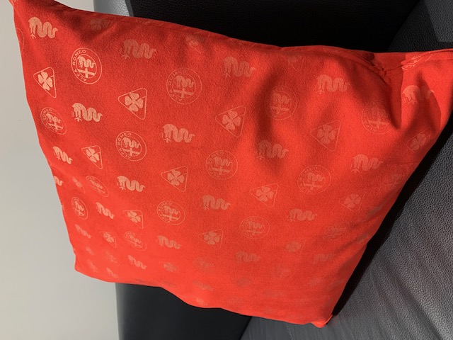 Alfa Romeo のアイデンティティーであるロゴ、ビショーネ、クアドリフォリオをプリントしたクッションです。