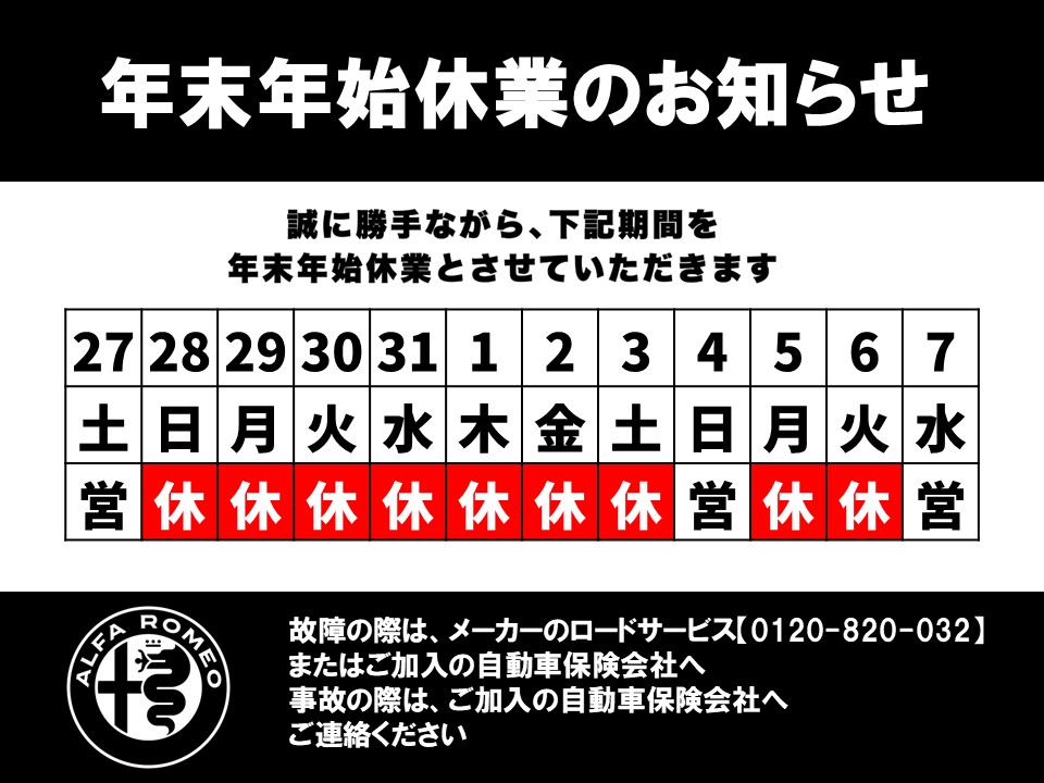 2025年12月28日~2026年1月3日まで休業致します。 ご迷惑をお掛けいたしますが、何卒宜しくお願い致します。